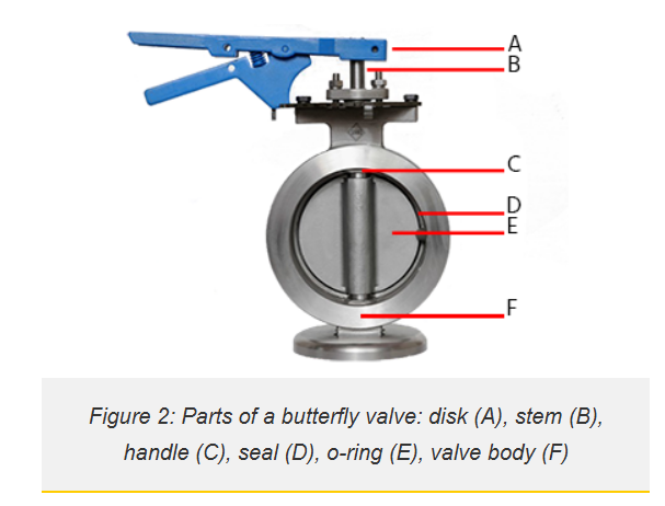 FunktionsprinzipAbsperrklappen sind relativ einfach aufgebaut. Abbildung 2 zeigt die Hauptkomponenten einer Absperrklappe: Gehäuse, Dichtung, Scheibe und Schaft. Die Scheibe (Abbildung 2 mit E gekennzeichnet) einer Absperrklappe ist auf die Mitte der angeschlossenen Rohrleitungen ausgerichtet und der Schaft (Abbildung 2 mit B gekennzeichnet) ist mit einem Stellantrieb oder Griff an der Außenseite der Klappe verbunden. In der geschlossenen Position steht die Scheibe senkrecht zur Strömung, wie in Abbildung 2 dargestellt, und dichtet gegen den Ventilsitz ab (Abbildung 2 mit D gekennzeichnet). Ein O-Ring (Abbildung 2 mit C gekennzeichnet) in der Spindelpackung dichtet gegen Leckagen entlang der Spindel ab. Wenn der Stellantrieb oder Griff den Schaft der Absperrklappe um 90° dreht, dreht sich auch die Scheibe um 90°, sodass sie parallel zum Durchfluss verläuft. Durch die Teildrehung kann der Durchfluss gedrosselt oder proportional erfolgen.