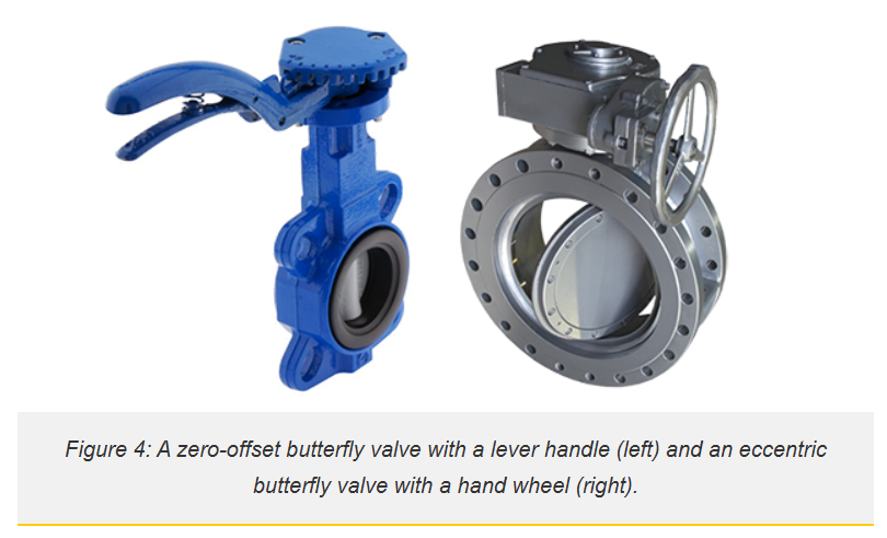Arten von AbsperrklappenAbsperrklappen gibt es in verschiedenen Ausführungen, die jeweils spezifische Anwendungen und Druckbereiche bedienen. Absperrklappen können nach ihrem Design des Scheibenverschlusses, dem Verbindungsdesign und der Betätigungsmethode kategorisiert werden. Design des Scheibenverschlusses. Absperrklappen können abhängig von der Position des Schafts im Verhältnis zur Mittellinie der Scheibe und dem Oberflächenwinkel des Ventilsitzes konzentrisch oder exzentrisch sein. Konzentrisch Das grundlegendste Design einer Absperrklappe ist eine zentrische oder konzentrische Absperrklappe. Der Schaft verläuft durch die Mittellinie der Scheibe und der Sitz ist der Innenumfang des Ventilkörpers (Abbildung 4 links). Diese Null-Offset-Ventilkonstruktion wird als elastisches Ventildesign bezeichnet, da eine effiziente Abdichtung auf der Flexibilität des Gummisitzes beruht. Beim Schließen kommt die Scheibe bei einer 90°-Drehung zunächst bei etwa 85° mit dem Sitz in Kontakt. Konzentrische Absperrklappen eignen sich für Niederdruckbereiche.